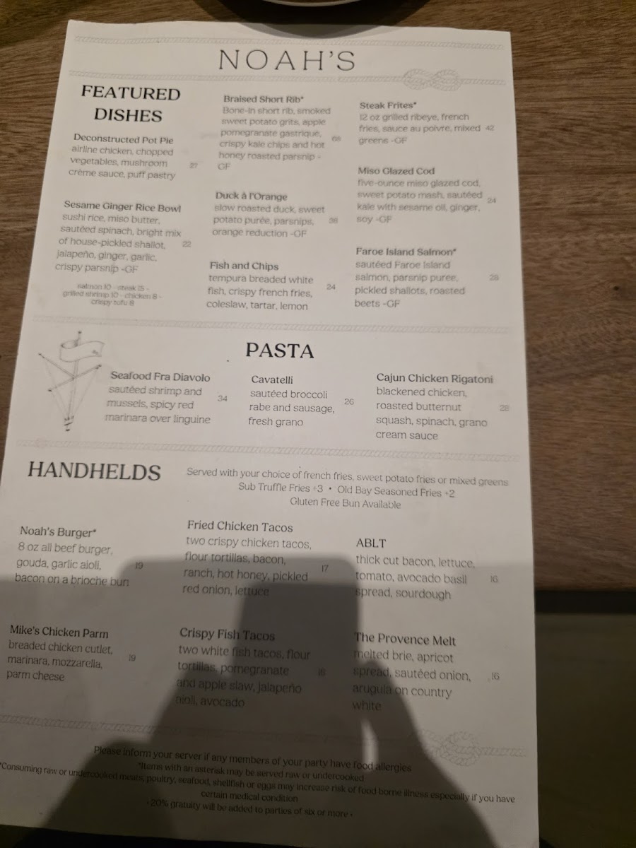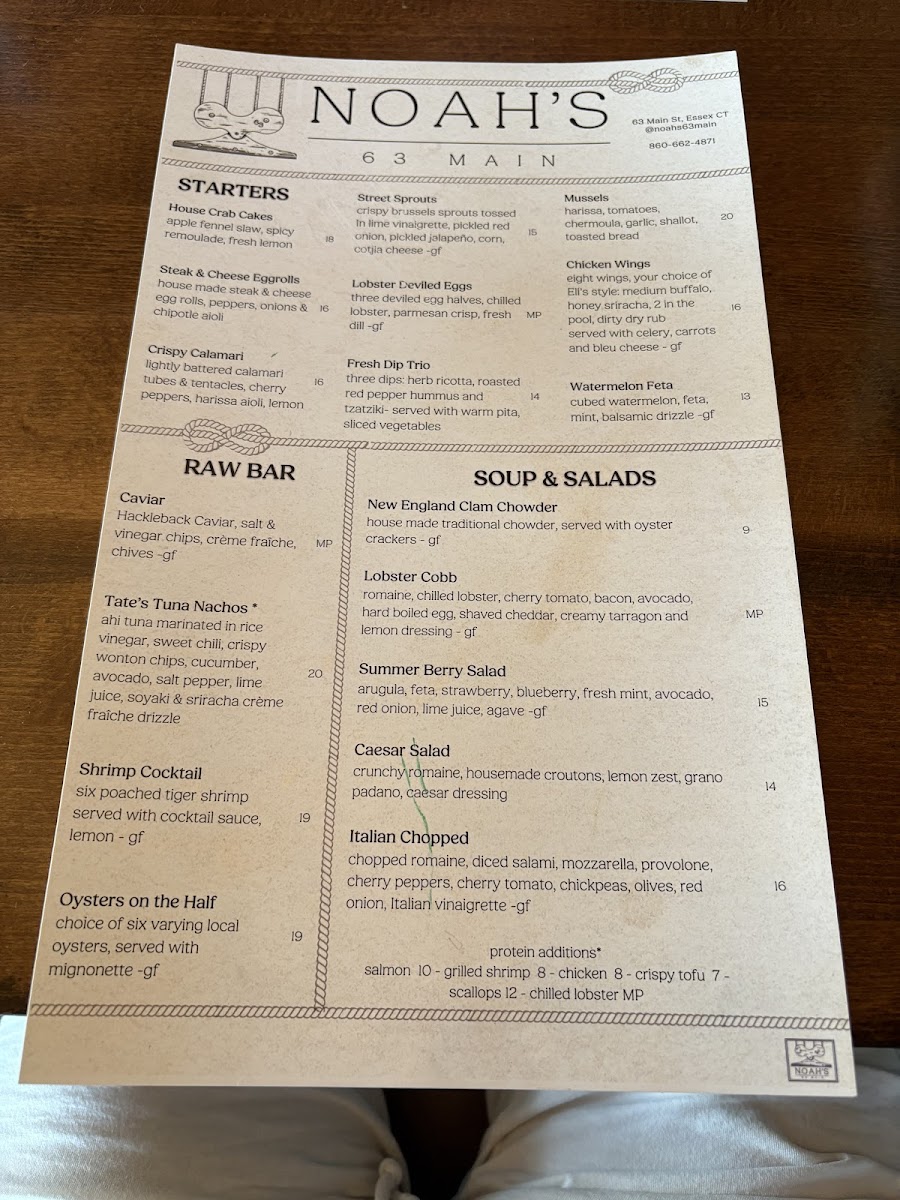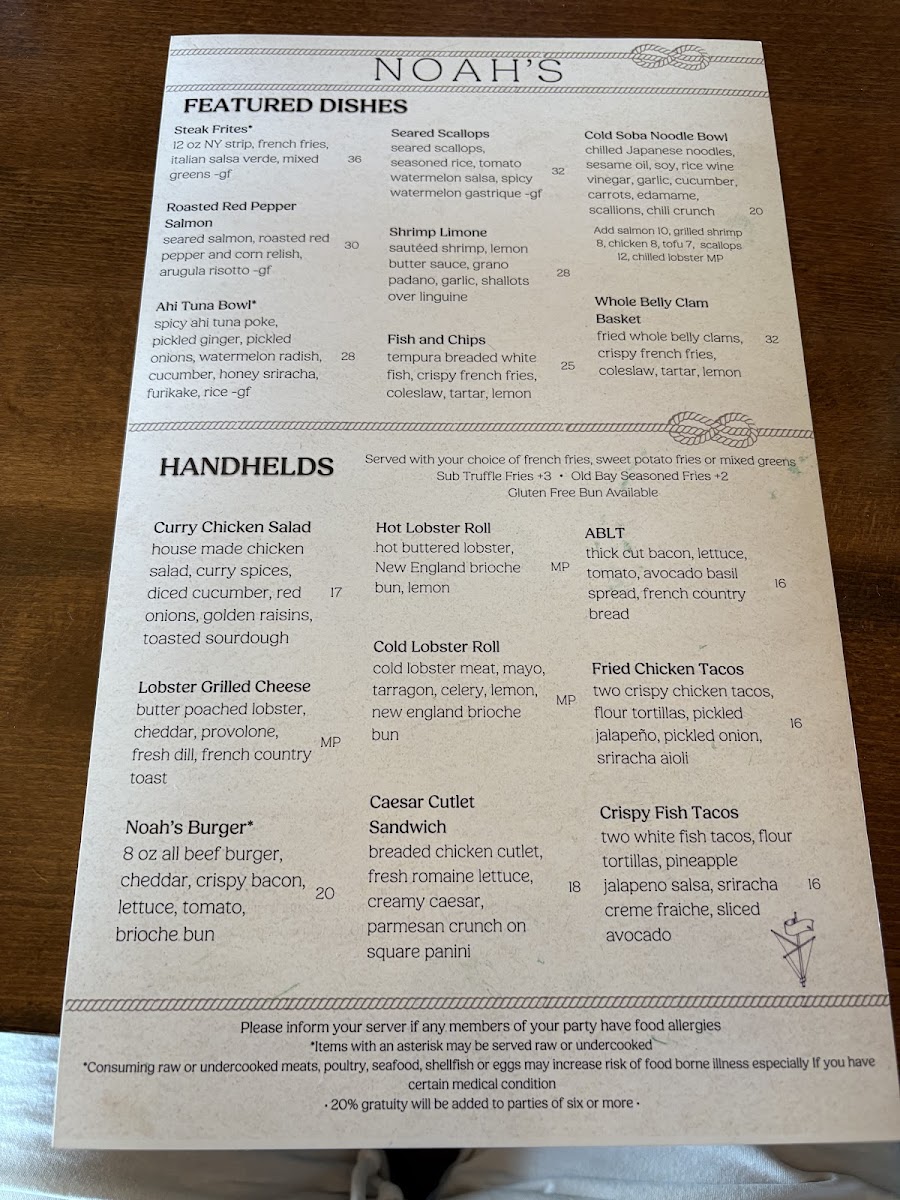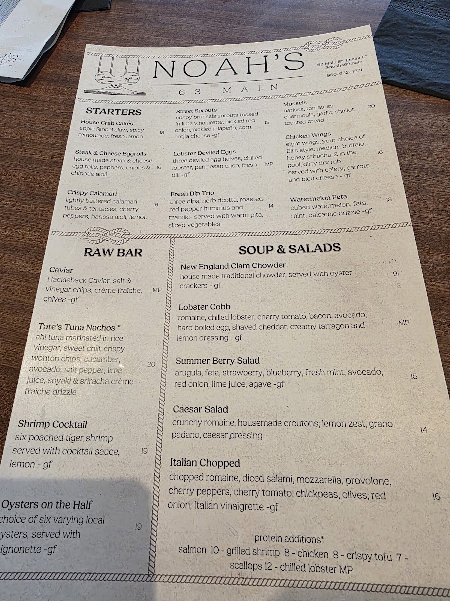 Noah's at 63 Main offers a diverse and satisfying menu, perfect for any occasion. For dessert, diners can indulge in sweet treats like Mini Churros, Chocolate Cannolis, or the classic NY Style Cheesecake. The entrees include a variety of flavorful options such as Duck Enchiladas, Shrimp Limone, and the ever-popular Fish & Chips. For a healthier choice, the Faroe Island Salmon or the flavorful Sesame Ginger Rice Bowl are great picks. Soups and salads provide comforting options like the creamy New England Clam Chowder, Broccoli Cheddar Soup, and fresh salads such as the Classic Caesar, Noah's Cobb, and Italian Chopped Salad. The kids' menu offers familiar favorites like the Kids Burger, Kids Chicken Tenders, and Kids Grilled Cheese, catering to younger appetites. For appetizers, there's an array of enticing options including Mussels, Deviled Eggs, Crab Cakes, and Steak & Cheese Eggrolls. Handhelds like the Fried Chicken Tacos, Fish Tacos, Provence Melt, and Chicken Milanese Sandwich provide easy-to-eat, flavorful meals. For a classic American choice, the Noah's Burger is a must-try. Whether you're in the mood for a light salad, a hearty entrée, or a delicious dessert, Noah's at 63 Main offers a menu that has something for everyone.