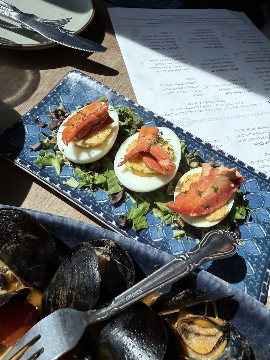 4 Deviled Eggs topped with bacon onion jam & fresh jalapeno